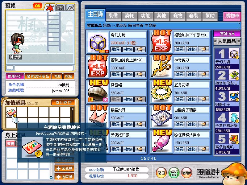 新手帳號創立第一次角色,首次進入商城可獲得免費體驗主題館7日劵,讓你天天都有不同的裝扮唷!!