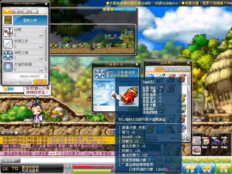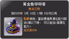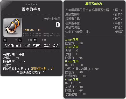 Jan 18, 2012 全民楓寶箱 活動時間: 2012/01/18 金寶箱及獎品道具描述這是個由怪物掉落的金色寶箱子,它可以被商城所購買的金鑰匙打開,如果你已經有這把金鑰匙,那就雙擊寶箱來開啟它。活動道具,打王後會隨機掉落金寶箱,這個鑰匙是用來開啟金寶箱,並有機會獲得一個稀有道具。財神常伴左右,永保財運亨通。使用椅子每10秒恢復MP100,HP100。精靈之王演奏的豎琴會發出奇妙的音色。使用豎琴椅子的話每10秒HP恢復50。看上去金光閃閃,銳氣千條!使用的話每10秒回覆HP,MP各50。(無法交換)LV70可使用,全屬性+10,物魔攻擊+3,5次衝卷(使用白金神奇剪刀可交易一次)。LV70可使用,全屬性+10,物魔攻擊+3,5次衝卷(使用白金神奇剪刀可交易一次)。LV50可使用,物魔攻擊+2,物魔防+7,7次衝卷。LV70可使用,智力+7,MaxMP+35,物魔攻擊+5,物魔防+25,5次衝卷,該手套在當年官網上名稱為”龍魔導士手套”,在遊戲內也發生過名稱顯示為”null”的事件。LV30可使用,物魔攻擊+3,物魔防+10,命中率+20,5次衝卷。 銀寶箱及獎品道具描述這是個由怪物掉落的銀色寶箱子,它可以被商城所購買的銀鑰匙打開,如果你已經有這把銀鑰匙,那就雙擊寶箱來開啟它。活動道具,打王後會隨機掉落銀寶箱,這個鑰匙是用來開啟銀寶箱,並有機會獲得一個稀有道具。清蒸深海鯛魚,相傳過年期間不能吃光才能年年有餘哦。可以恢復HP 50%。好吃的鮮肉餃子,圓圓滿滿的樣子就像元寶哦。可以HP/MP恢復50%。香噴噴的烤雞,過年期間食用象徵吉祥。效果MP恢復50%。鮮甜的髮菜肉羹,吃了讓你發大財。可以HP/MP 恢復100%。用熊掌製作的中藥。喝過後頭腦清晰,15分鐘內命中值提升200。據說服下後可以就會有如同神仙一樣的法力,15分鐘內魔法攻擊力會上升10。用蛇尾所製作的中藥。喝下它會深強體壯,15分鐘內攻擊力會上升8。能除妖魔鬼怪的新年鞭炮,5分鐘物理攻擊力+10,魔法攻擊力+10。成功率100%,物理攻擊力+3。調整裝備現在的屬性,使其跟混沌的卷軸比起來更好或更壞。成功率:60%使卷軸使用次數用完的裝備直接強化到3星階段 (可搭配裝備保護卷軸使用,避免強化失敗裝備被破壞。強化失敗時,裝備會被破壞。[強化 成功率] 80%使卷軸使用次數用完的裝備直接強化到4星階段 (可搭配裝備保護卷軸使用,避免強化失敗裝備被破壞。強化失敗時,裝備會被破壞。[強化 成功率] 60%使卷軸使用次數用完的裝備直接強化到5星階段 (可搭配裝備保護卷軸使用,避免強化失敗裝備被破壞。強化失敗時,裝備會被破壞。[強化 成功率] 50%可升級次數不會削減,並會於一般等級裝備道具上賦予潛在能力。只有一般等級道具可使用,成功率 100%。點選兩下潛力能力於2個以下的道具上所使用的話,就會額外賦予1種潛在能力。成功率 80%點選兩下#潛力能力於2個以下的道具上所使用的話,就會額外賦予1種潛在能力。成功率50%。以潛在能力以外的道具為對象,將其道具的所有屬性初始化為標準能力值,只有在裝備道具尚可以使用,成長型道具則是會回到成長之前的狀態。若是衝捲次數歸零就無法再使用 成功率 70%,失敗時會以30%機率破壞道具。提高下一個卷軸的成功機率10%。潛在能力賦予卷軸類與裝備強化卷軸類無效。對裝備道具使用,以後只限1次,在卷軸使用失敗之後,阻止裝備的損壞,1次的防禦效果會消失,對強化階段+12以上的道具無效。 (觀戰者提供) 資訊來源標題原始連結■Θ全民楓寶箱Θ■0118《V142更新開機公告》相關Youtube影片