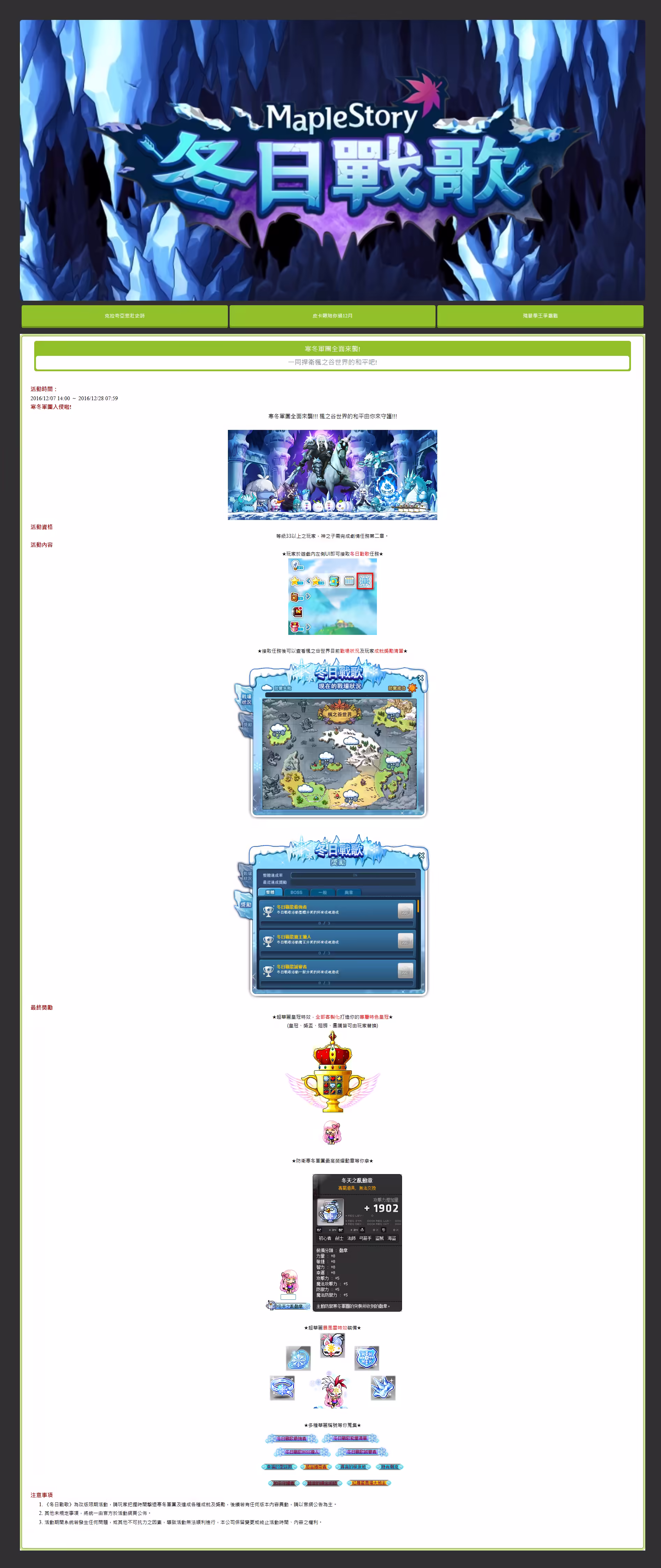 Dec 17, 2016 寒冬軍團全面來襲! - 一同捍衛楓之谷世界的和平吧! 活動日期: 2016年12月07日~2016年12月28日 (七海凜彌提供) 資訊來源標題原始連結【寒冬軍團】邪惡勢力全面入侵楓之谷!